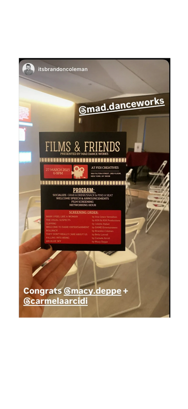 Films & Friends marked an exciting debut for MAD Dance Works, bringing together artists, creators, and dance lovers for a powerful evening of movement, film, and connection on March 27, 2025 in New York City. Founded by Macy Deppe, the event was born out of a desire to fill a gap in the dance industry—providing a platform for both emerging and established artists to share their work through the medium of film.