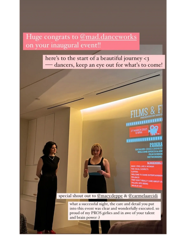 As MAD Dance Works’ first official initiative, Films & Friends set the tone for a growing community committed to creativity, connection, and artistic visibility. We are deeply grateful to everyone who joined us and helped make the evening so memorable.